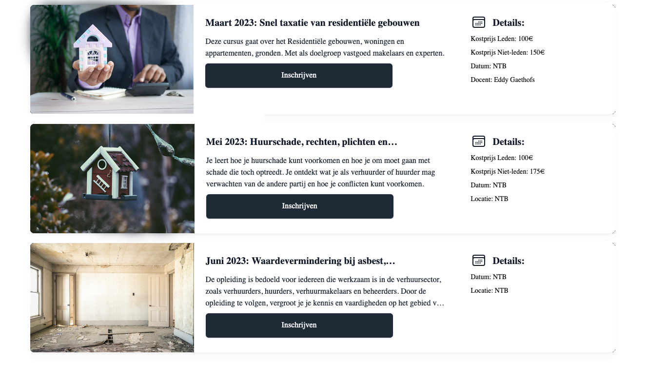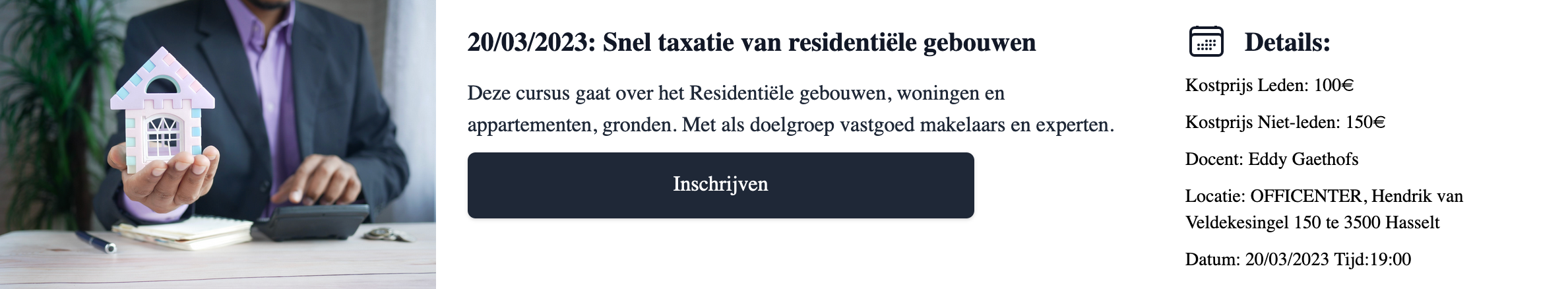 Op 20 maart 2023 wordt er een opleiding gegeven over sneltaxatie van Residentieel Vastgoed. Deze opleiding gaat door in Officenter Hasselt, Hendrik van Veldekesingel 150. De opleiding gaat van start om 19.00 uur met als docenten Eddy Gaethofs en Kevin Gaethofs. Voor vastgoedmakelaars is deze opleiding opgenomen in EDUX.